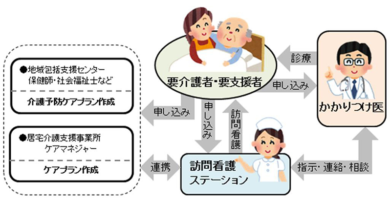 訪問看護の利用にあたり主治医からの「訪問看護指示書」が必要になります。訪問看護をご利用になりたい場合は、かかりつけ医やケアマネージャー、地域包括支援センターまたは当ステーションにご相談ください。